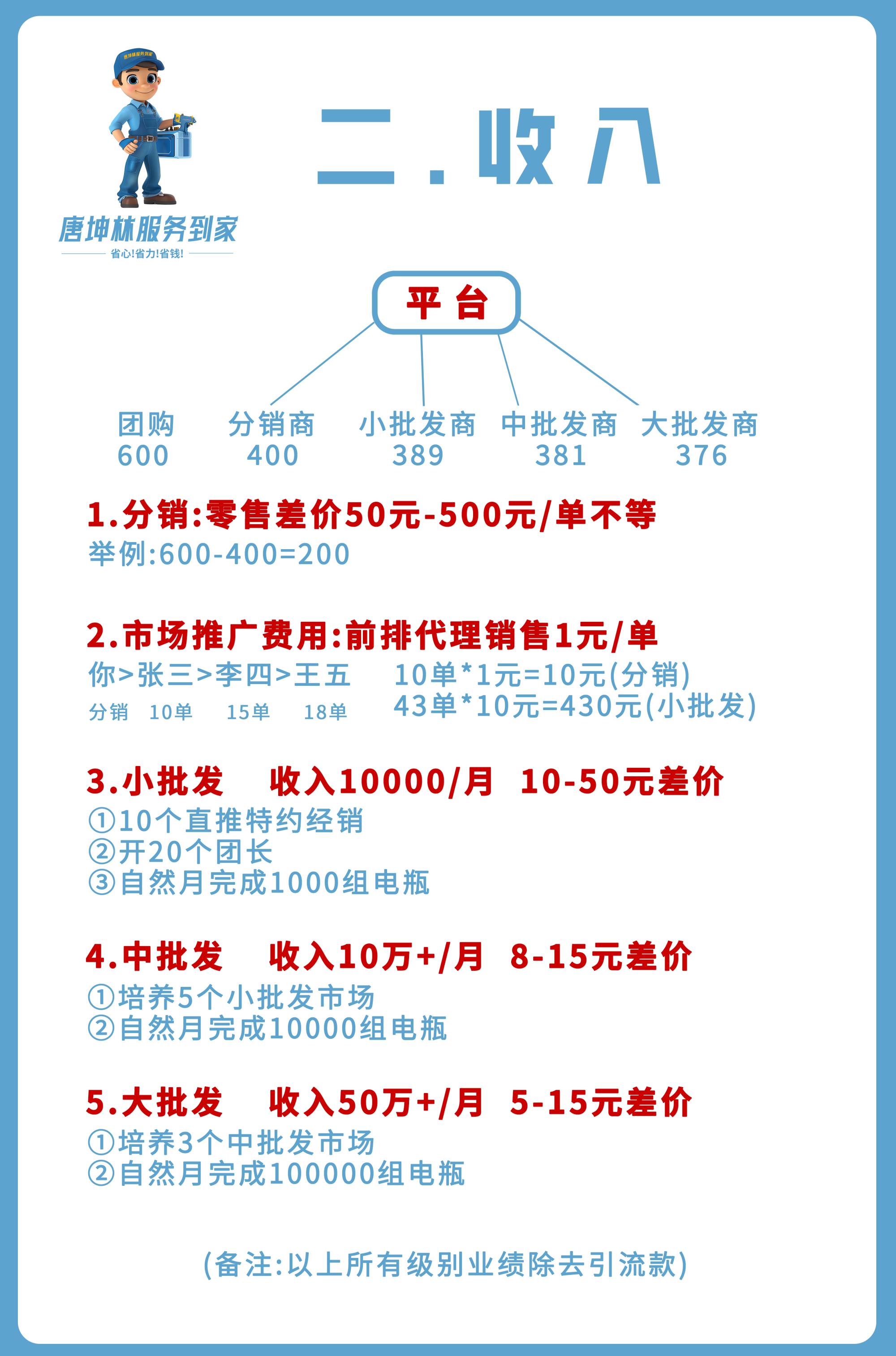 团长(分销商)通过在平台下单采购电池,以高于平台采购价的价格销售给终端用户,赚取差价作为利润。